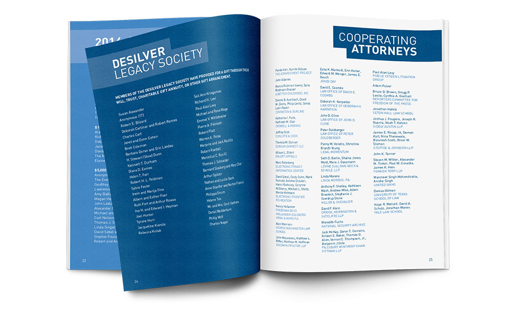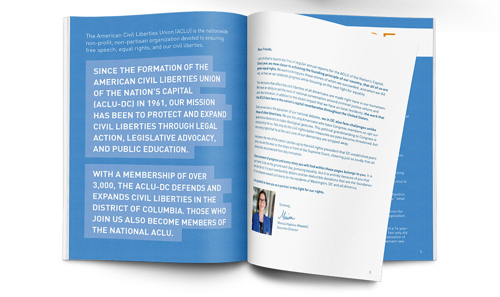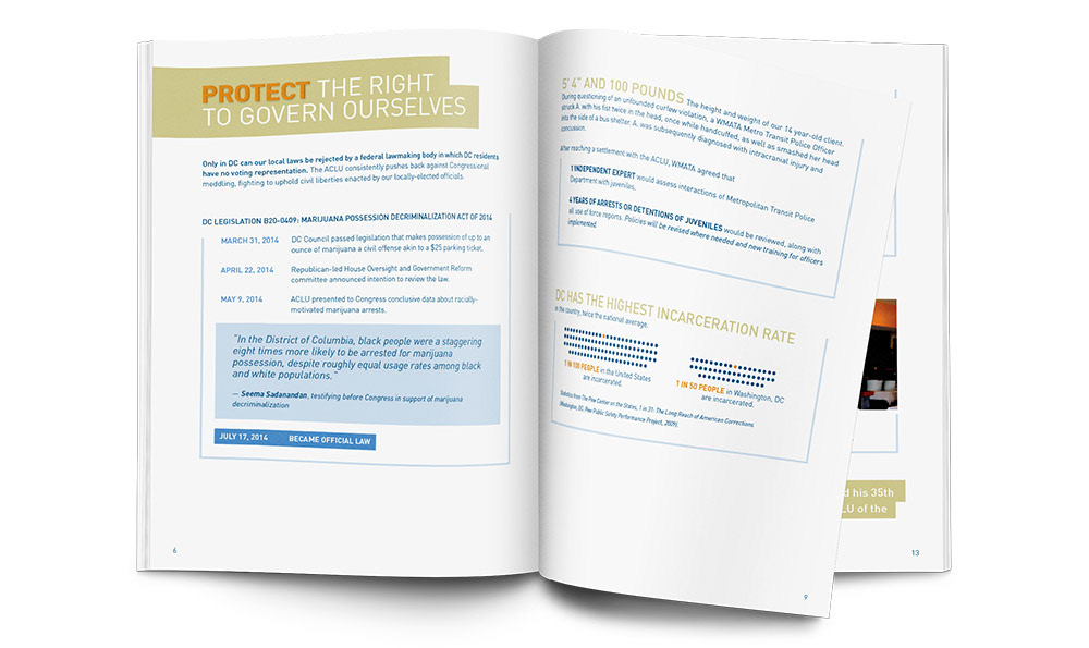 The ACLU is a nationwide non-profit, non-partisan, membership organization devoted to ensuring free speech, equal rights, and other civil liberties. I worked with the DC Chapter in designing their 2014-2015 Annual Report.